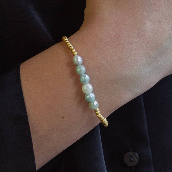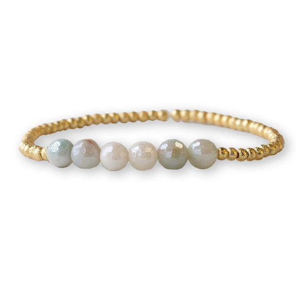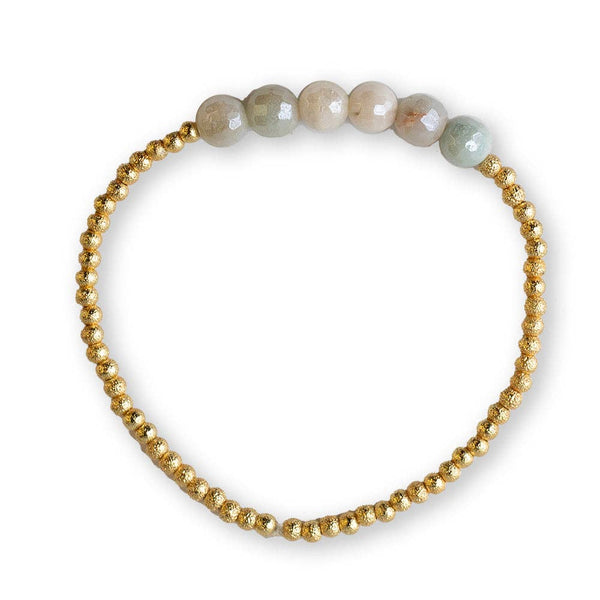 This piece features delicate tarnish-proof gold beads paired with faceted gems in a soft, romantic spring palette.