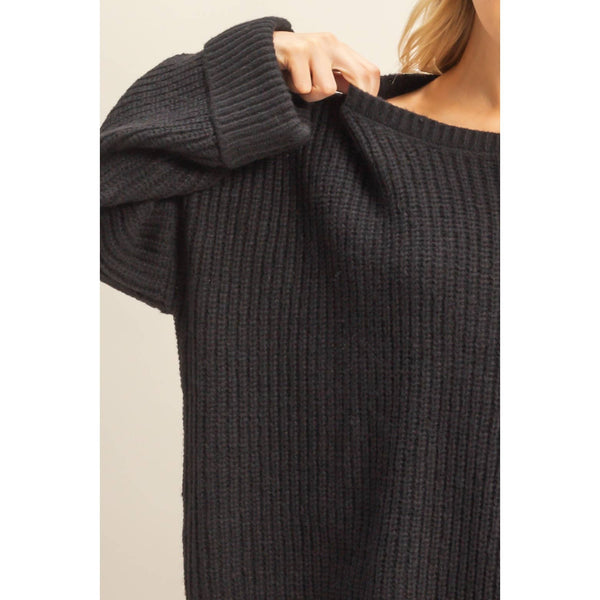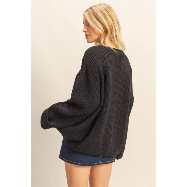Embrace comfort with this oversized ribbed knit sweater, featuring dropped shoulders for a relaxed fit and a chic pocket detail. Ideal for layering over a collared shirt, this piece ensures style and versatility.