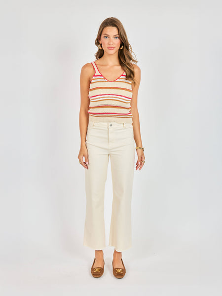The Copper Cloud Sweater Tank features a crochet design in a tan and brown color palette accented with a red stripe. The adjustable straps allow for a customized fit, enhancing comfort and versatility in various settings. This piece is suitable for layering or standalone wear, catering to distinct style preferences.
