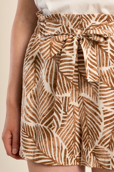 The Palms Shorts feature a front tie design and a distinct camel and ivory pattern, providing an aesthetic appeal suitable for various occasions. The combination of colors enables versatile styling, while the front tie allows for an adjustable fit, enhancing comfort and support.