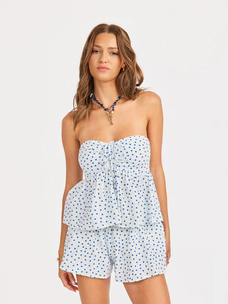 Effortless coastal charm meets playful style with the Tidepool Polka Dot Top. This strapless design features crisp white fabric adorned with cheerful blue polka dots, perfect for warm-weather days. The included tie option lets you customize your look—wear it bare-shouldered for a modern silhouette or tie it up for added security and coverage. Versatile enough for beach outings, casual brunches, or sunset gatherings, this top brings a fresh, breezy vibe to any warm-weather wardrobe.